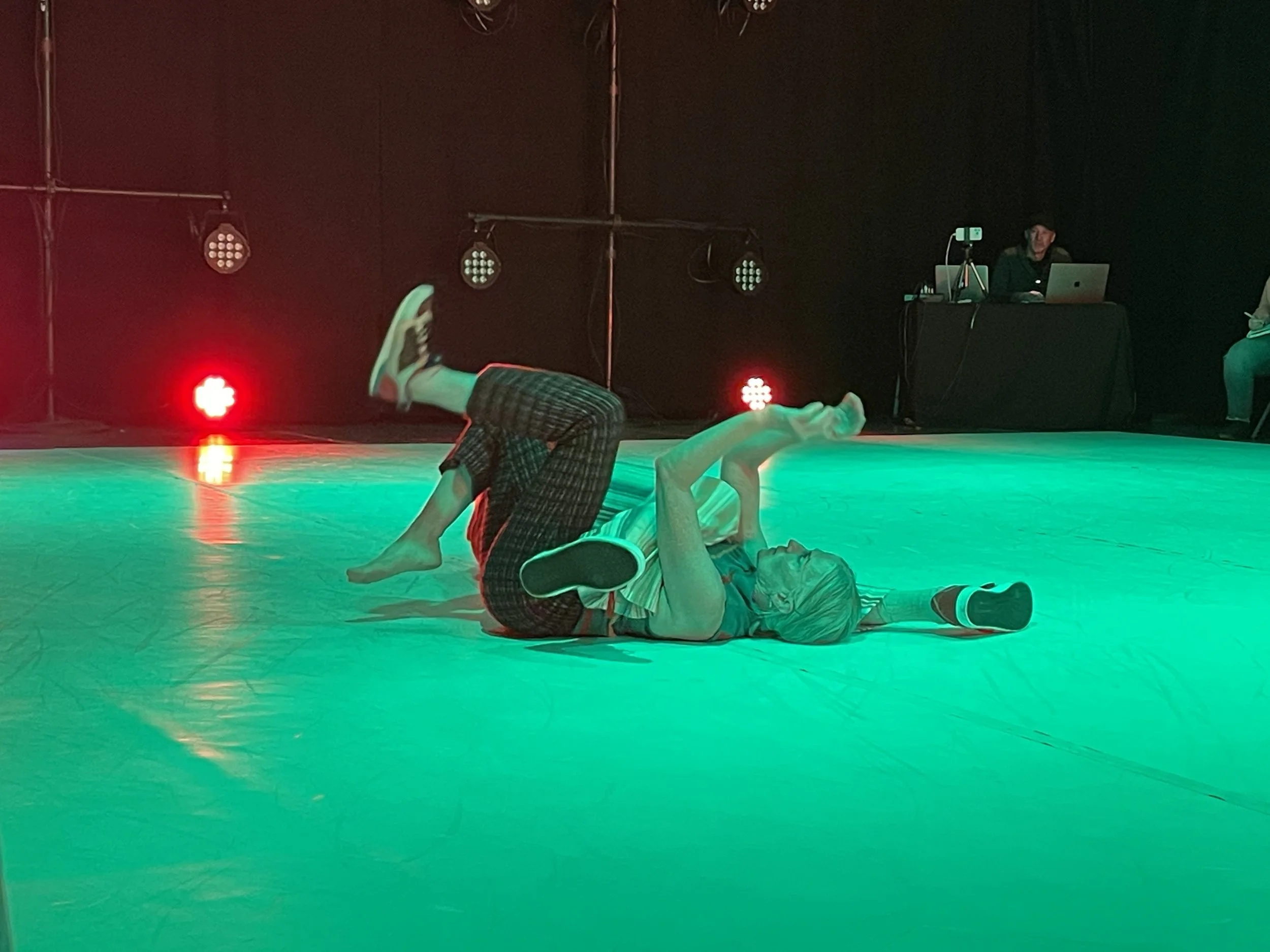 In this performance, Eisen and Barrett move around the space, waving their arms, throwing playful kicks, and experimenting with formations that reflect their own intuitive movement styles. They echo each other’s gestures, making occasional physical contact, and, in separate iterations, roll together to the floor. At one point, Barrett kicks off one shoe, then the other, as the lights progress through an intense palate of red then blue, green to aquamarine. Eisen glides effortlessly through the radiances, his imposing frame anchoring the garage space while Barrett’s movements bring her in closer contact with the seated audience, creating a sense of intimacy and spontaneity. Together, they embody the legacy of innovation that Eisen has contributed to the Chicago dance community, blending improvisation with a unique collaborative spirit.