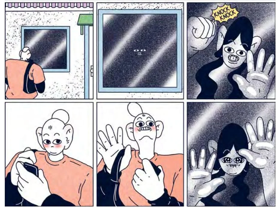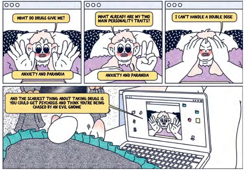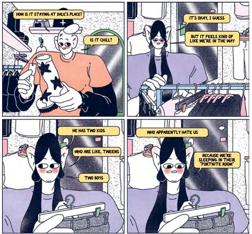 Buff Soul can be read as a graphic travel diary that delivers the plot one would expect when foreign rockstars play in Texas for the first time. Lina and Moa’s other best friend Asa are in a band called ShitKid, set to perform at SXSW, an annual media festival in Austin, Texas. Before the festival, Moa, who wants a break from the stress of making ends meet as a freelance artist, joins their couch surfing adventure in America to chill out and take life “damn easy” for a little while. Unexpectedly, memories involving Moa’s late friend Sofia pop up throughout the trip, turning what’s supposed to be a relaxing break into a week-long internal battle with herself. Moa struggles with how to feel better and with how to tell her best friends Asa and Lina about it.