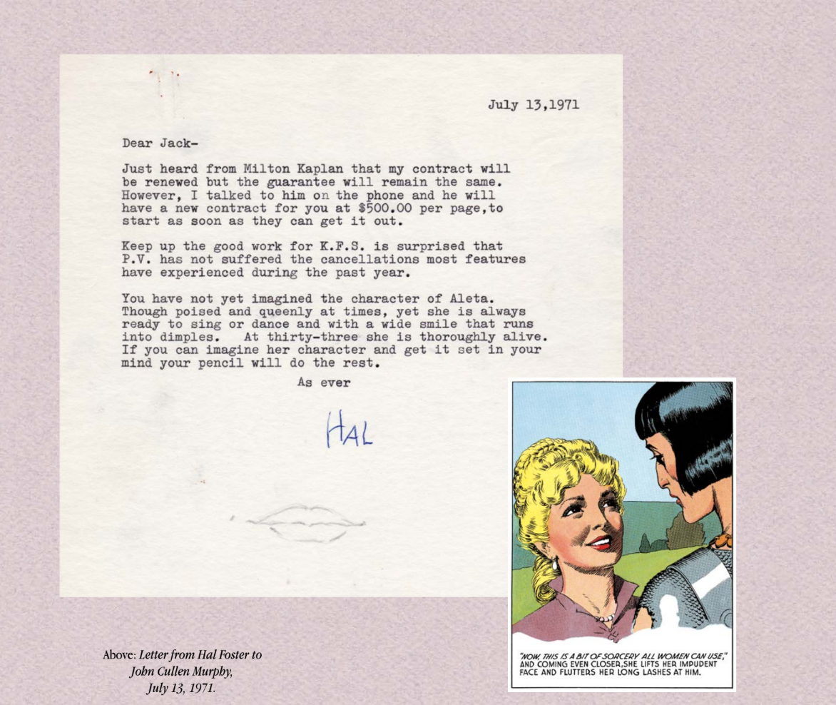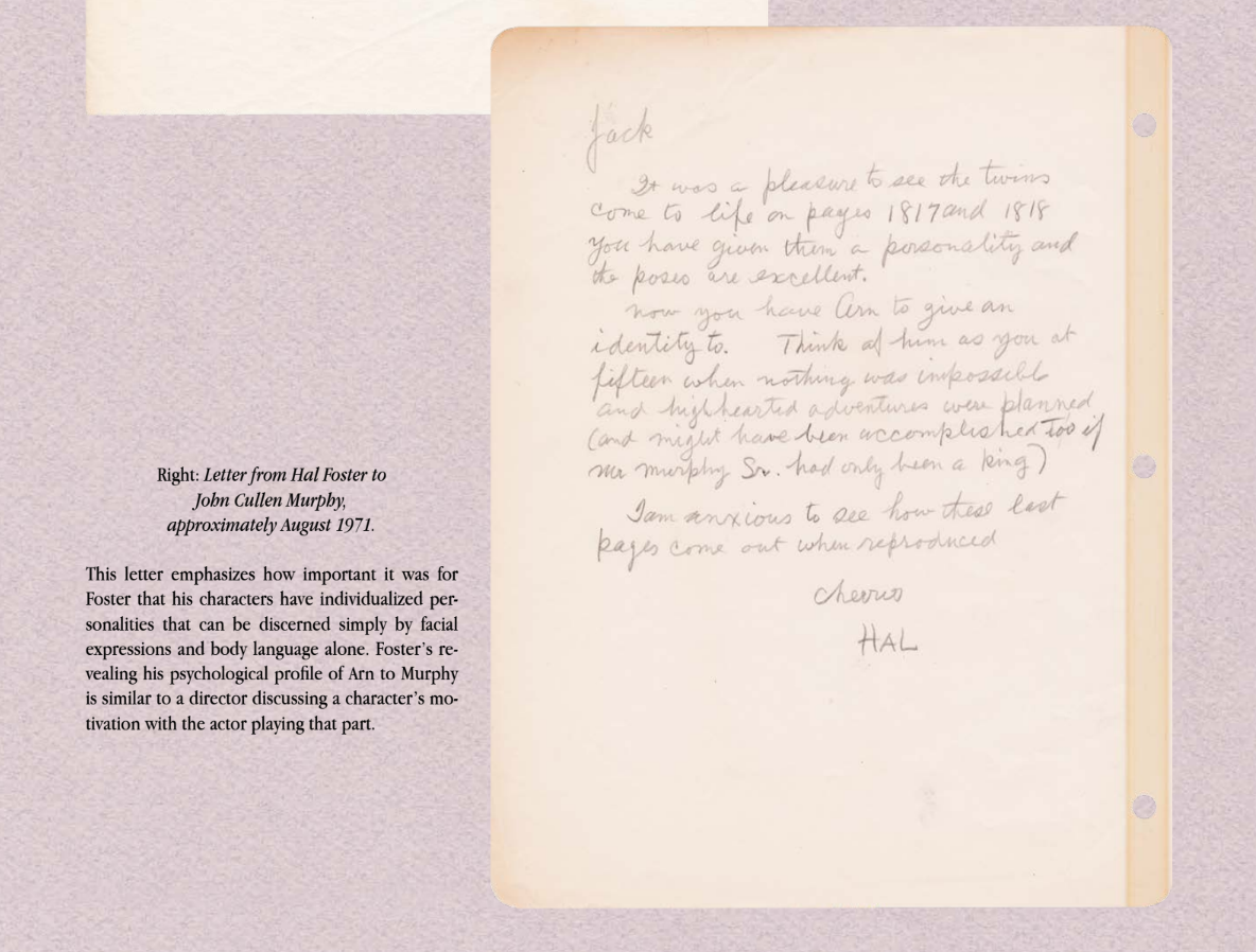While praising Prince Valiant’s historical impact within the comic world, Kane also emphasizes the tedious process of comic making. The process is fascinating, explored through exclusive documents such as authentic letters, storyboards, and sketches. It is through these interactive visuals where the reader gets a taste of the pair’s partnership. Foster’s personality and dry humor nearly jump off the page in his letters to Murphy. The reader doesn’t get to see how Murphy received these letters, so we rarely get a glimpse into his personality. Instead, Kane explores Murphy’s coloring talents and Foster’s notable unwavering trust in him. Foster created foundations, plotlines, and the general skeleton of each week’s new strip, while Murphy made sure the panels had the proper aesthetics to reel readers into their imagined world. Though Kane doesn’t explain how Foster’s narratives initially came to be, he sheds light on the partners’ process, creating a space dedicated to praising functionality and community in the artistic workplace.